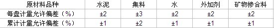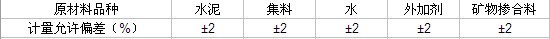 注:1.累計(jì)計(jì)量允許偏差,是指每一運(yùn)輸車中每盤用各種原材料計(jì)量和的偏差。