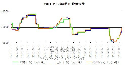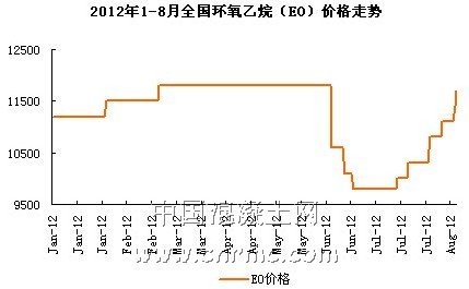 2012年8月,環(huán)氧乙烷似乎步入旺季階段,近期成交量略有放大,價格持續(xù)走高,主要原因還是由于市場供貨短缺,供不應(yīng)求所造成的。14、15日價格各上漲300元/噸,目前市場報盤價格在11400-11900元/噸附近。市場主要特征:一是市場走勢堅(jiān)挺,價格繼續(xù)在上升的通道中運(yùn)行;二是乙二醇價格連續(xù)上漲,在比價效應(yīng)的影響下,環(huán)氧乙烷市場漲價也在情理之中;三是部分生產(chǎn)裝置進(jìn)入檢修,市場供應(yīng)量有所下降,對行情形成一定的支撐。