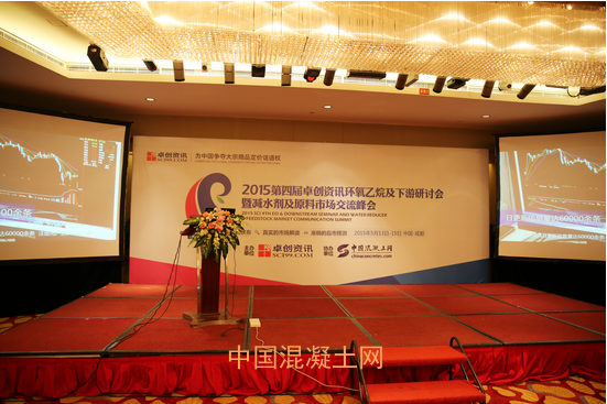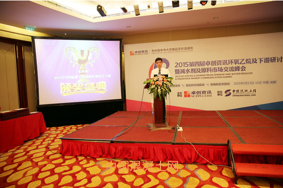 “2015第四屆卓創(chuàng)咨詢環(huán)氧乙烷及下游研討會暨減水劑及下原料市場交流峰會”于5月14日在成都萬達(dá)大飯店隆重召開,本次會議由卓創(chuàng)咨詢集團(tuán)主辦,中國混凝土網(wǎng)協(xié)辦,共有來自國企、民企及合資的環(huán)氧乙烷生產(chǎn)廠及國內(nèi)外下游企業(yè)、國內(nèi)新聞媒體、咨詢公司等近200位代表參加。會議期間,由中國混凝土網(wǎng)舉辦的2014年度“東科杯”中國混凝土外加劑企業(yè)綜合十強(qiáng)、“奧克杯”聚羧酸減水劑企業(yè)十強(qiáng)及“東科杯”2014年度外加劑行業(yè)最佳企業(yè)形象獎(jiǎng)?lì)C獎(jiǎng)典禮會議也在當(dāng)天盛大舉行。