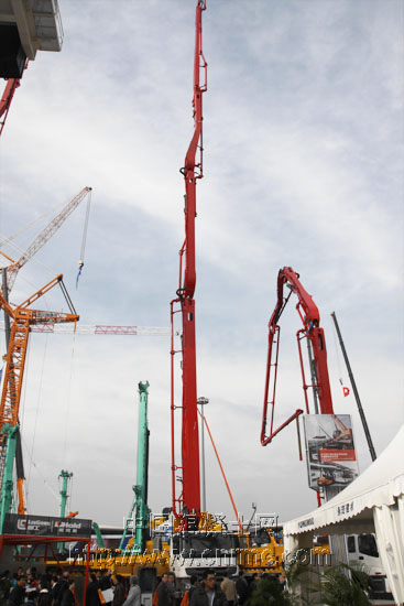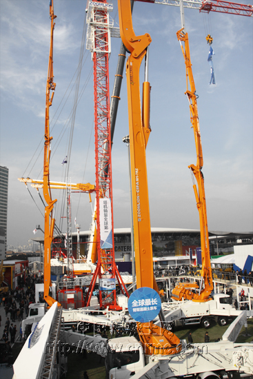 中聯(lián)重科作為中國(guó)工程機(jī)械行業(yè)的領(lǐng)軍企業(yè),本次共攜旗下8個(gè)主機(jī)事業(yè)部的40多臺(tái)產(chǎn)品參會(huì),總參展面積達(dá)到近8000平方米。如今中聯(lián)重科以國(guó)際市場(chǎng)為目標(biāo)的戰(zhàn)略意圖已非常明顯,而此次參展上海寶馬展,中聯(lián)重科所展出的產(chǎn)品不但產(chǎn)品線齊全,數(shù)量多,而且其中多項(xiàng)產(chǎn)品所采用的技術(shù)已經(jīng)達(dá)到了世界最先進(jìn)水平,其中,打破多項(xiàng)世界紀(jì)錄,創(chuàng)下吉尼斯世界最長(zhǎng)臂架泵車紀(jì)錄的101米混凝土泵車在展會(huì)上顯得尤為搶眼。這款長(zhǎng)臂架泵車融合了意大利CIFA技術(shù),為7橋7節(jié)臂長(zhǎng)101米,是全球最長(zhǎng)臂架泵車,具有 “碳纖維復(fù)合臂架與輕量化技術(shù)”的特點(diǎn),開創(chuàng)了混凝土機(jī)械技術(shù)發(fā)展全新“里程碑”。據(jù)悉,此款101米長(zhǎng)臂架泵車可以輕松覆蓋30層以下建筑的混凝土澆筑施工,改寫了30層建筑需要反復(fù)變換混凝土澆筑方式的低效率操作方式,使95%的高層建筑‘一泵到底’成為可能,這也大大提高了建筑施工的整體工作效率。