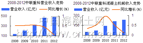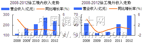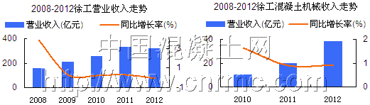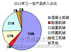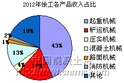 徐工機(jī)械2012年全年實(shí)現(xiàn)營(yíng)業(yè)收入321.32億元,同比下降2.54%;實(shí)現(xiàn)營(yíng)業(yè)利潤(rùn)25.1億元,同比下降35.61%;混凝土機(jī)械實(shí)現(xiàn)營(yíng)業(yè)收入38.25億元,同比增長(zhǎng)93.67%。根據(jù)今年一季度報(bào)告顯示,徐工機(jī)械實(shí)現(xiàn)營(yíng)業(yè)收入66.23 億元,同比下降17%。在國(guó)內(nèi)工程機(jī)械行業(yè)中,徐工集團(tuán)是以起重機(jī)和路面機(jī)械見(jiàn)長(zhǎng),而混凝土機(jī)械雖然在徐工整個(gè)產(chǎn)業(yè)中所占比例并不高,面對(duì)混凝土機(jī)械的巨大市場(chǎng),徐工在近兩年也是奮起直追,其市場(chǎng)占有率正在逐步提升。