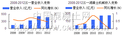 三一重工目前是全球最大的混凝土機(jī)械制造商,2012年全年公司實(shí)現(xiàn)營(yíng)業(yè)收入468.31億元,同比減少7.77%,營(yíng)業(yè)利潤(rùn)60.97億元,同比減少38.08%。公司全年混凝土機(jī)械實(shí)現(xiàn)營(yíng)業(yè)收入265.09億元,同比增長(zhǎng)1.8%。2012年盡管行業(yè)整體經(jīng)濟(jì)環(huán)境不理想,但作為三一的主力板塊,混凝土機(jī)械仍然發(fā)展勢(shì)頭良好,銷售額穩(wěn)居全球第一。根據(jù)今年一季度報(bào)告顯示,三一重工實(shí)現(xiàn)營(yíng)業(yè)收入112.30 億元,同比下降23.5%,受到市場(chǎng)景氣度下降的影響,混凝土機(jī)械業(yè)務(wù)也受到較大的競(jìng)爭(zhēng)壓力,增速日漸趨緩。