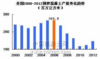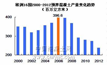 根據(jù)相關(guān)數(shù)據(jù)統(tǒng)計(jì),2006年歐盟預(yù)拌混凝土年產(chǎn)量3.96億立方米,達(dá)到近年高峰值,之后產(chǎn)量逐年下降,2012年預(yù)拌混凝土年產(chǎn)量?jī)H2.4億立方米。
