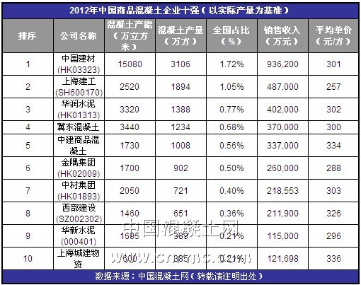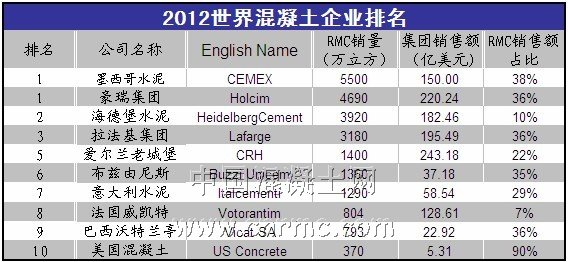 根據(jù)2012年世界混凝土企業(yè)排名情況來(lái)看,國(guó)際行業(yè)巨頭的預(yù)拌混凝土銷(xiāo)量已經(jīng)趨于平穩(wěn)狀態(tài),并出現(xiàn)逐年下降趨勢(shì),和中國(guó)企業(yè)巨頭相比,國(guó)際水泥混凝土企業(yè)的發(fā)展已經(jīng)受到限制,而中國(guó)企業(yè)的發(fā)展還將突飛猛進(jìn)。