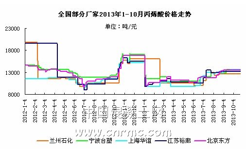 隨著之前停車檢修的廠家重新開(kāi)車,10月份企業(yè)開(kāi)工率將回升,市場(chǎng)供應(yīng)量將逐漸恢復(fù),屆時(shí)將相對(duì)充足,丙烯酸價(jià)格在此期間也將有所上漲,但上漲期間過(guò)后將會(huì)逐步進(jìn)入到平穩(wěn)過(guò)渡期間。目前丙烯酸普酸價(jià)格在13300元/噸附近,比7月初上漲約2000元/噸,增幅達(dá)16.67%,9、10月份的價(jià)格處于年內(nèi)價(jià)格最高點(diǎn)。因此中國(guó)混凝土網(wǎng)預(yù)計(jì),在下游需求比較穩(wěn)定的情況下,2013年年底之前,產(chǎn)品價(jià)格很難再繼續(xù)上漲,但如果未來(lái)下游行業(yè)需求繼續(xù)保持良好,價(jià)格能保持穩(wěn)定,并維持在高位的話,那么2013年總體情況相對(duì)于2012年來(lái)說(shuō)還是不錯(cuò)的。