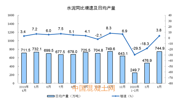 根據(jù)國家統(tǒng)計局數(shù)據(jù)顯示,2020年1-4月份,全國累計水泥產(chǎn)量5.21億噸,同比下降14.4%;4月份,全國單月水泥產(chǎn)量2.23億噸,同比增長3.8%。