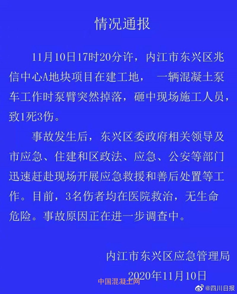 11月10日,有網(wǎng)友爆料稱,內(nèi)江市東興區(qū)兆信中心在建工地發(fā)生事故導致人員傷亡。記者從內(nèi)江市東興區(qū)應急管理局處確認,11月10日17時20分許,內(nèi)江市東興區(qū)兆信中心A地塊項目在建工地,一輛混凝土泵車工作時泵臂突然掉落,砸中現(xiàn)場施工人員,致1死3傷。