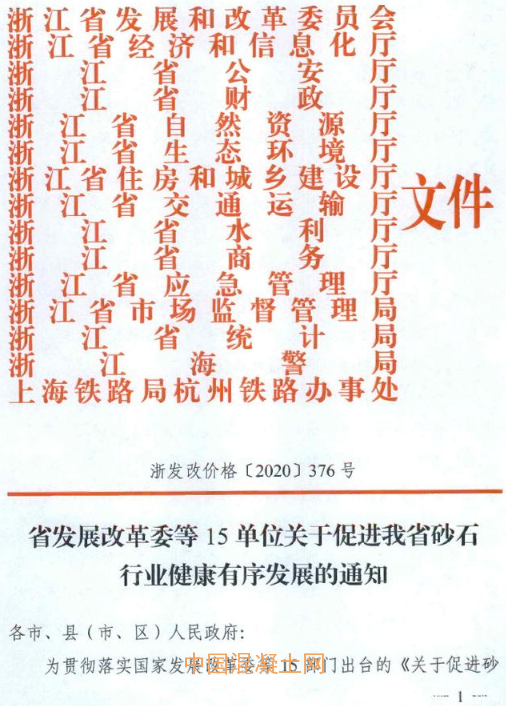 日前,浙江省發(fā)展改革委等15單位聯(lián)合印發(fā)了《關(guān)于促進(jìn)我省砂石行業(yè)健康有序發(fā)展的通知》,以穩(wěn)定浙江省砂石市場(chǎng)供應(yīng)、保持價(jià)格總體平穩(wěn)。