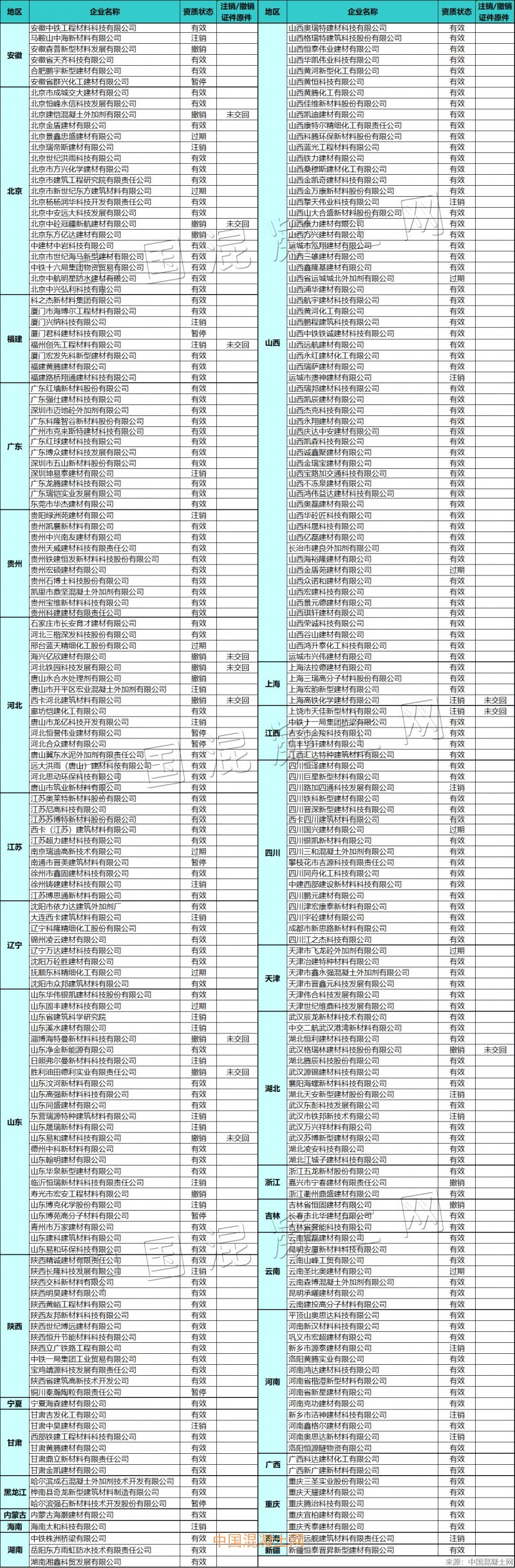 根據(jù)中國混凝土網(wǎng)的統(tǒng)計,截止2021年4月9日,鐵道部聚羧酸高效減水劑產(chǎn)品認(rèn)證在列企業(yè)共281家(包含認(rèn)證撤銷/注銷、過期失效、暫停的企業(yè)),具體名單如下: