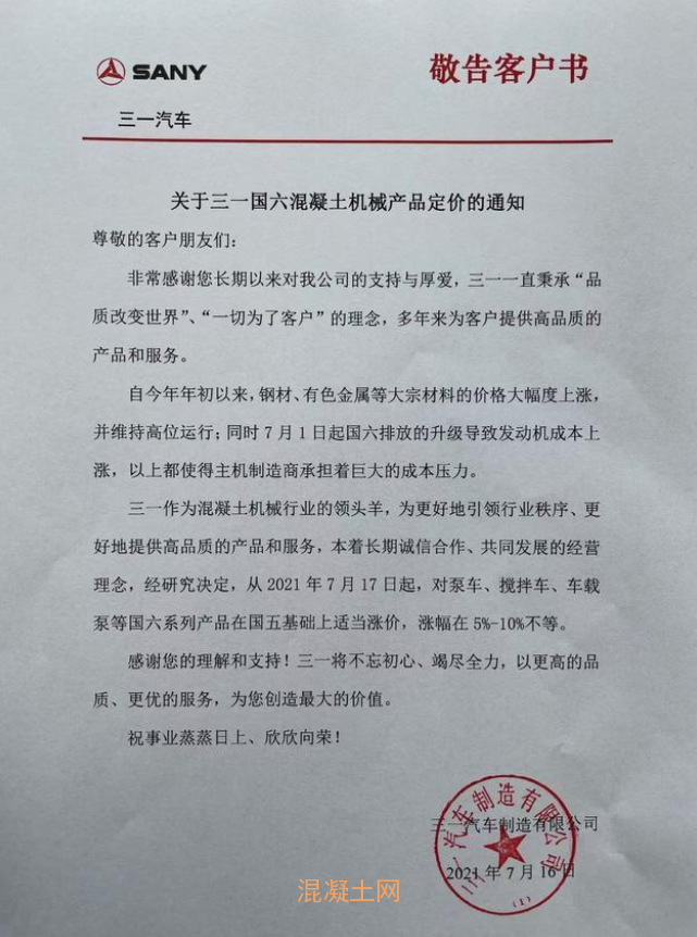 三一重工決定,從2021年7月17日起,對(duì)泵車(chē)、攪拌車(chē)、車(chē)載泵等國(guó)六系列產(chǎn)品在國(guó)五基礎(chǔ)上適當(dāng)漲價(jià),漲幅在5%-10%不等。
