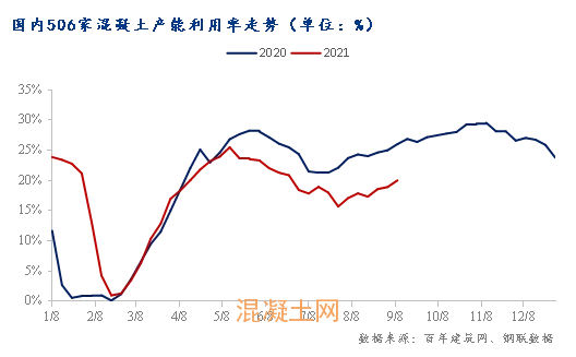從跟蹤多期的混凝土數(shù)據(jù)來看,墊資壓力早已成為多數(shù)混凝土企業(yè)今年的“心病”,且隨著時(shí)間推移進(jìn)一步的加深,近段時(shí)間材料價(jià)格連續(xù)上漲由市場(chǎng)競(jìng)爭(zhēng)帶來的利潤進(jìn)一步壓縮情況也愈發(fā)突出,9月作為傳統(tǒng)旺季,但樣本企業(yè)混凝土整體量、價(jià)都較去年同期存在不小的差距。通過攪拌站反饋來看,未來一段時(shí)間內(nèi),混凝土量、價(jià)仍會(huì)在這兩種因素疊加情況下緩慢提升。預(yù)計(jì)下一期混凝土產(chǎn)能利用率有望回升至21%以上,但是較去年同期的差距難有明顯減少。