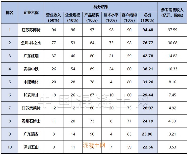 部分企業(yè)因數(shù)據(jù)提供不完整、不及時,暫未被列入其中,望相關(guān)企業(yè)在下次評選中積極踴躍參與,共同推動外加劑行業(yè)的繁榮與發(fā)展。由于時間有限,本次評選難免有所疏忽,若其中數(shù)據(jù)有所偏差,請聯(lián)系我們!