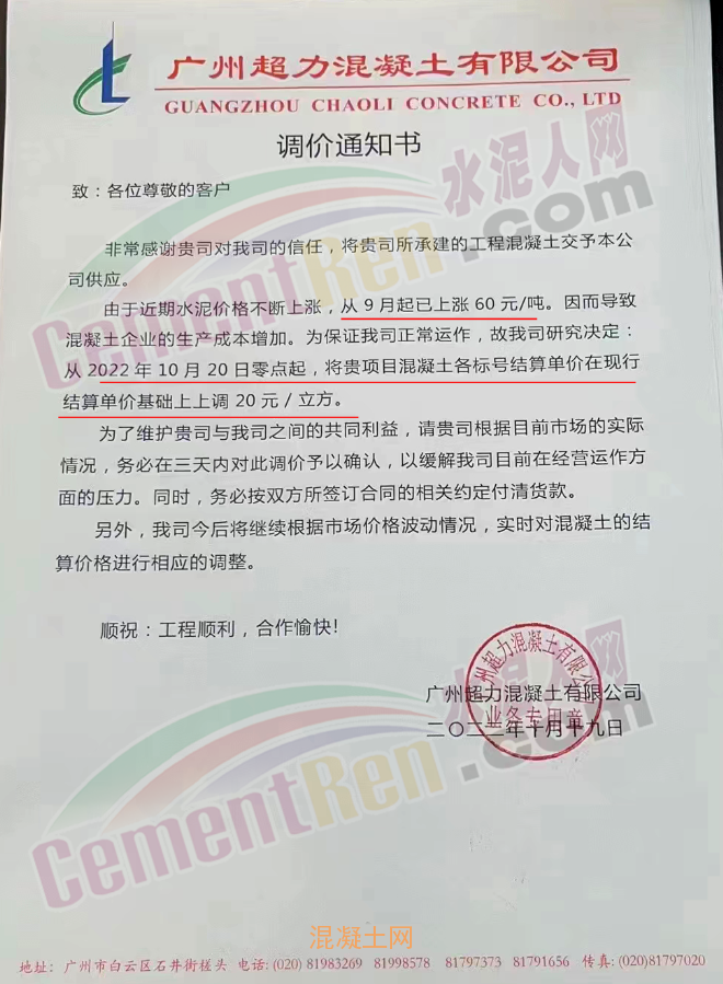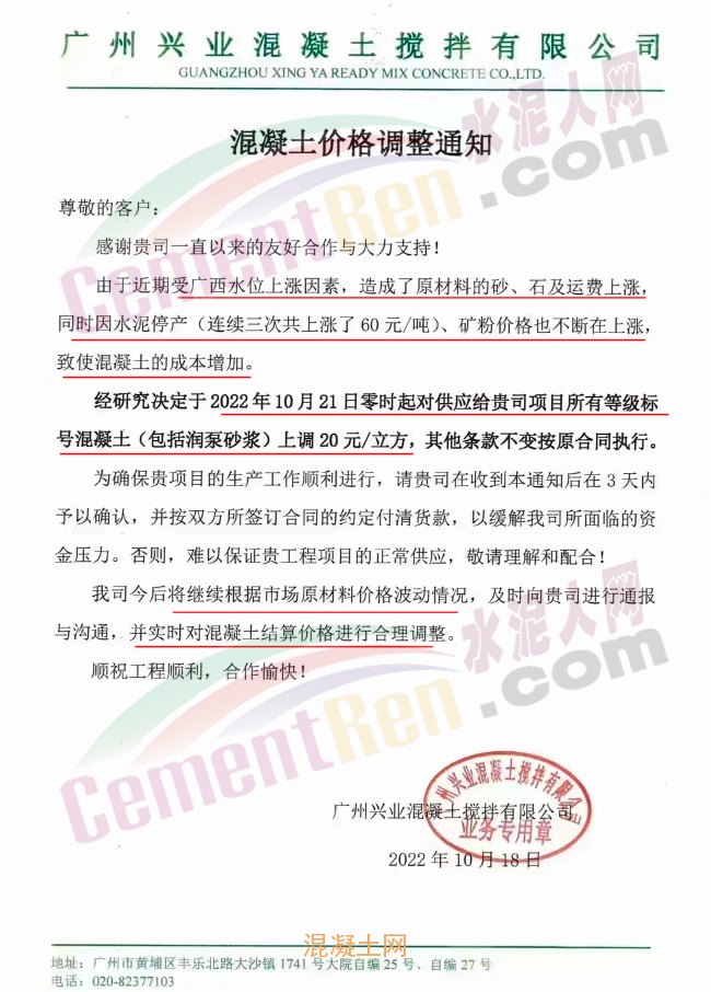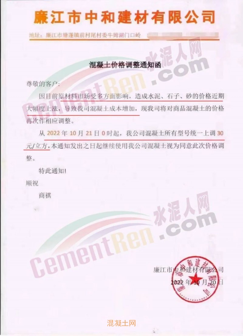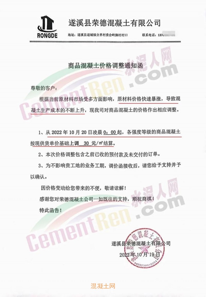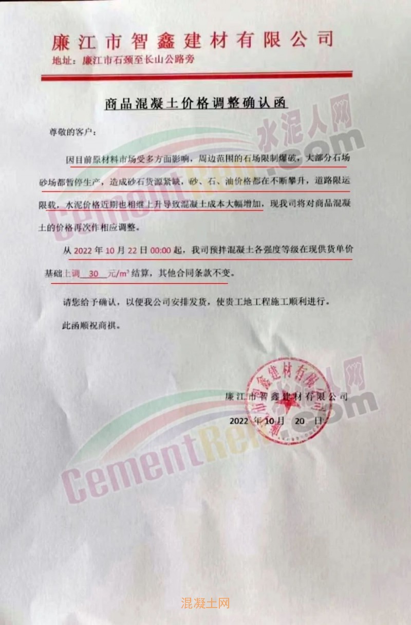 其中,廣東廉江市智鑫建材有限公司通知稱(chēng),因目前原材料市場(chǎng)受多方面影響,周邊范圍的石場(chǎng)限制爆破,大部分石場(chǎng)、砂場(chǎng)都暫停生產(chǎn),造成砂石貨源緊缺。砂、石、油價(jià)格都在不斷攀升,道路限運(yùn),限載,水泥價(jià)格近期也相繼上升,導(dǎo)致混凝土成本大幅增加。