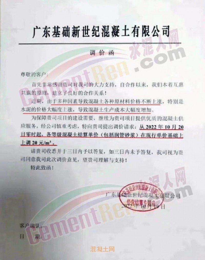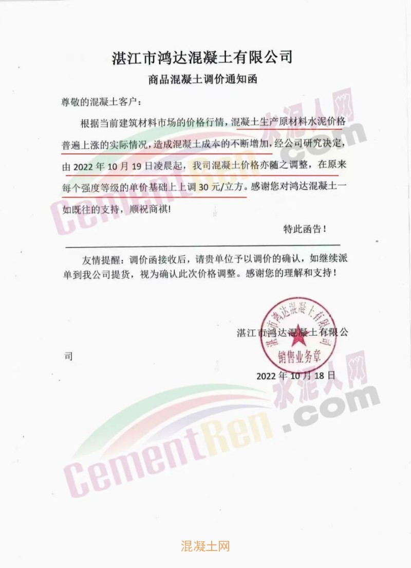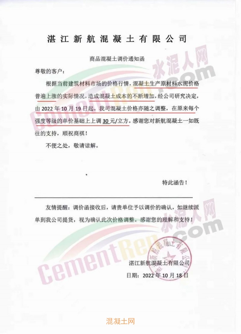 日前,廣東省內(nèi)廣東廉江市智鑫建材有限公司、廉江市鵬港混凝土有限公司、湛江市鴻達(dá)混凝土有限公司、湛江新航混凝土有限公司、廉江市中和建材有限公司、遂溪縣榮德混凝土有限公司、廣州勇創(chuàng)混凝土有限公司、廣東基礎(chǔ)新世紀(jì)混凝土有限公司、廣州興業(yè)混凝土攪拌有限公司、廣州超力混凝土有限公司、廣州市華合建筑材料有限公司、廣東永泰混凝土有限公司等十多家企業(yè)通知混凝土價(jià)格基礎(chǔ)上上調(diào)10-30元/立方。