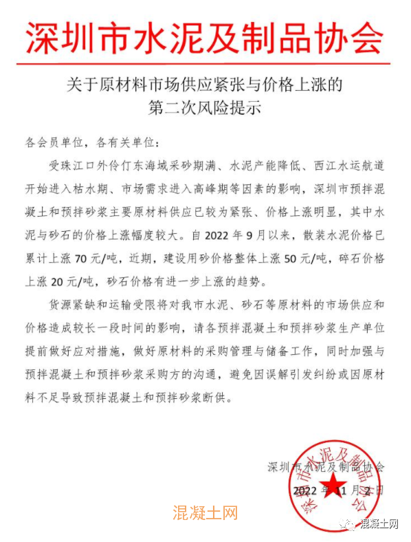 11月2日深圳市水泥及制品協(xié)會(huì)發(fā)布《關(guān)于原材料市場(chǎng)供應(yīng)緊張與價(jià)格上漲的第二次風(fēng)險(xiǎn)提示》稱,受采砂期滿、水泥產(chǎn)能降低、西江水運(yùn)航道開始進(jìn)入枯水期、市場(chǎng)需求進(jìn)入高峰期以及水泥、砂石報(bào)價(jià)上漲等因素的影響,珠三角區(qū)域局部市場(chǎng)出現(xiàn)材料供應(yīng)緊張情況。