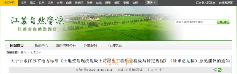 根據(jù)《省市場監(jiān)督管理局關(guān)于下達2020年度第一批江蘇省地方標準項目計劃的通知》(蘇市監(jiān)標〔2020〕190號)的要求,由江蘇山水國土資源開發(fā)工程有限公司牽頭起草的江蘇省地方標準《土地整治現(xiàn)澆混凝土防滲渠工程質(zhì)量檢驗與評定規(guī)程》已經(jīng)完成征求意見稿編制工作,現(xiàn)向社會各界公開征求意見。請各有關(guān)單位和專家積極提出意見和建議,并于2022年12月14日前反饋至標準編寫單位。
