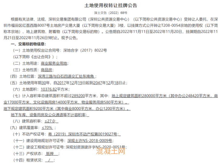 不過,目前該項目已在14個月前停工。據(jù)深圳公共資源交易中心公告,該宗地建設(shè)項目自2021年9月開始停工,宗地按現(xiàn)狀轉(zhuǎn)讓。