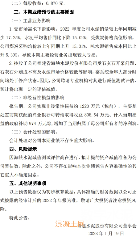 受市場(chǎng)需求下滑影響,2022年度公司水泥銷(xiāo)量較上年同期減少17.25%,水泥平均售價(jià)同比下降15.02%;受煤炭?jī)r(jià)格高位影響,公司煤炭采購(gòu)均價(jià)較上年同期上升15.31%,噸水泥銷(xiāo)售成本同比上升5.39%,導(dǎo)致本期主要經(jīng)營(yíng)業(yè)務(wù)出現(xiàn)較大虧損。