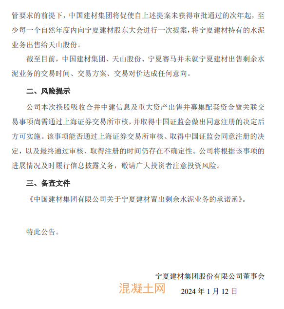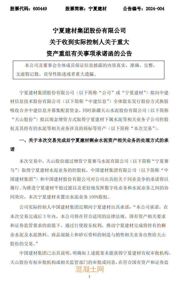 2024年1月13日,寧夏建材集團(tuán)股份有限公司發(fā)布《關(guān)于收到實(shí)際控制人關(guān)于重大資產(chǎn)重組有關(guān)事項(xiàng)承諾函》的公告。