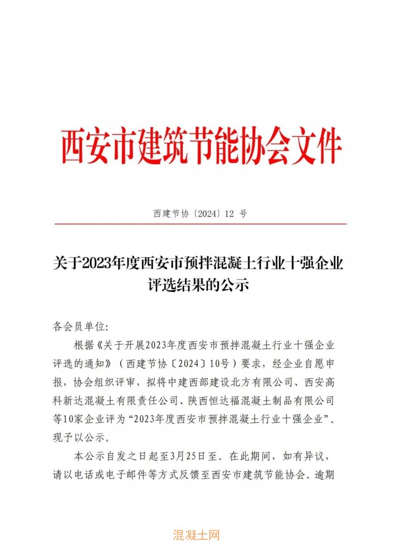 根據(jù)《關(guān)于開(kāi)展2023年度西安市預(yù)拌混凝土行業(yè)十強(qiáng)企業(yè)評(píng)選的通知》(西建節(jié)協(xié)〔2024〕10號(hào))要求,經(jīng)企業(yè)自愿申報(bào),協(xié)會(huì)組織評(píng)審,擬將中建西部建設(shè)北方有限公司、西安高科新達(dá)混凝土有限責(zé)任公司、陜西天石實(shí)業(yè)有限責(zé)任公司等10家企業(yè)評(píng)為“2023年度西安市預(yù)拌混凝土行業(yè)十強(qiáng)企業(yè)”。現(xiàn)予以公示。
