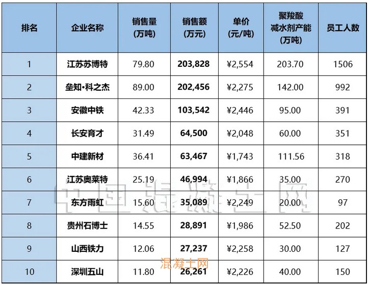 2023年中國聚羧酸減水劑企業(yè)十強是中國混凝土網(wǎng)經(jīng)多方調查統(tǒng)計,以2023年各企業(yè)聚羧酸系減水劑實際銷售收入(除稅)為主要排名依據(jù),以企業(yè)的聚羧酸減水劑銷售量、產能、以及市場占有率等各方面數(shù)據(jù)進行綜合評分。統(tǒng)計數(shù)據(jù)主要來源為各外加劑企業(yè)自報、上市企業(yè)年報以及工商年審資料等。