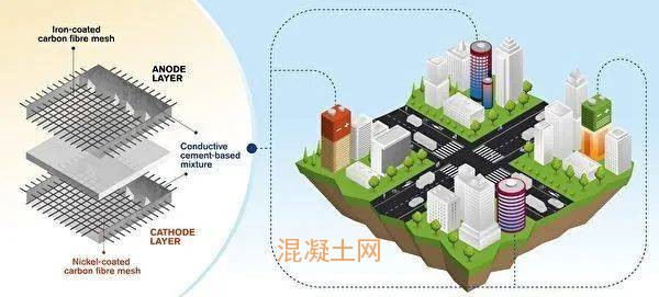 首先,在水泥中添加少量短碳纖維形成具有導(dǎo)電和彎曲韌性的水泥基混合物。然后,在混合物中嵌入一層金屬涂層的碳纖維網(wǎng)做電極——鐵作陽(yáng)極,鎳作陰極。這就是水泥基電池的原型。