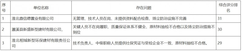 (一)資質(zhì)人員方面?;幢宾挝涔べQ(mào)有限公司等企業(yè)未提供技術(shù)負(fù)責(zé)人社保憑證;濉溪縣新盛新型建材有限公司等企業(yè)技術(shù)負(fù)責(zé)人試驗(yàn)室主任、試驗(yàn)員長(zhǎng)期不在崗履職;淮北相城新型環(huán)保建材有限責(zé)任公司等企業(yè)技術(shù)負(fù)責(zé)人、中級(jí)職稱人員提供社保憑證與受檢企業(yè)不一致;安徽鼎信德置業(yè)有限公司對(duì)檢查文件不熟悉,現(xiàn)場(chǎng)無管理人員、技術(shù)人員,未提供相關(guān)資料配合檢查。