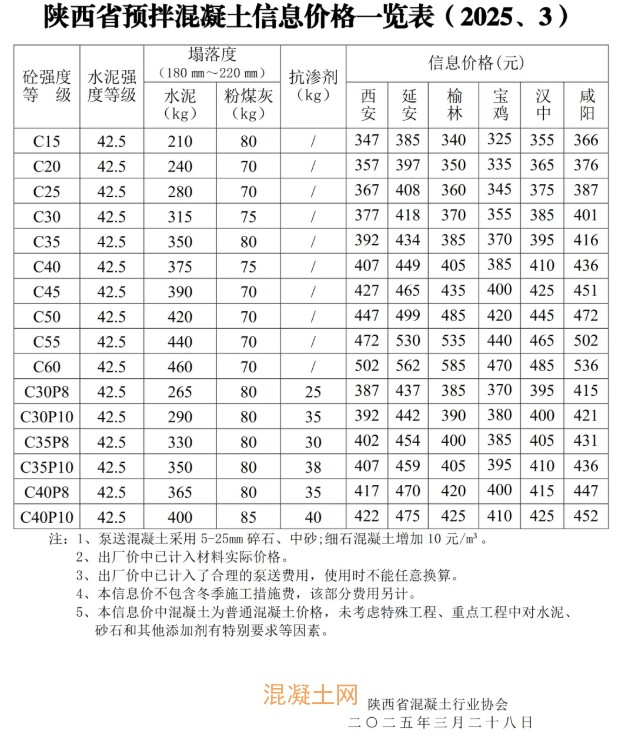 陜西省預(yù)拌混凝土信息價(jià)格一覽表(2025、3)