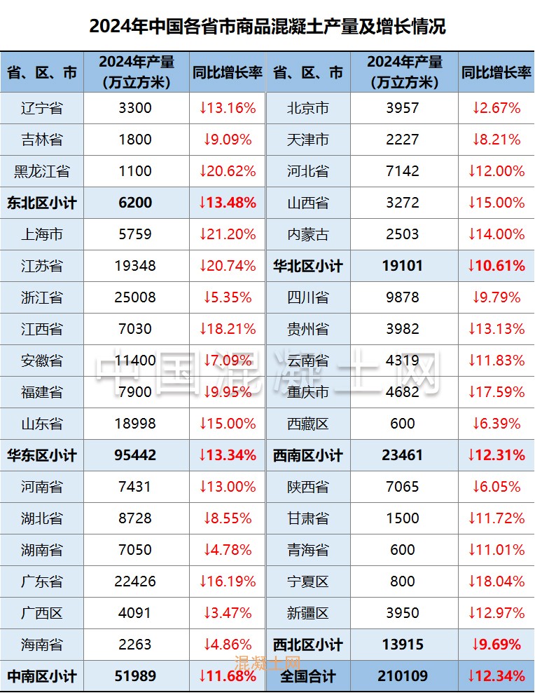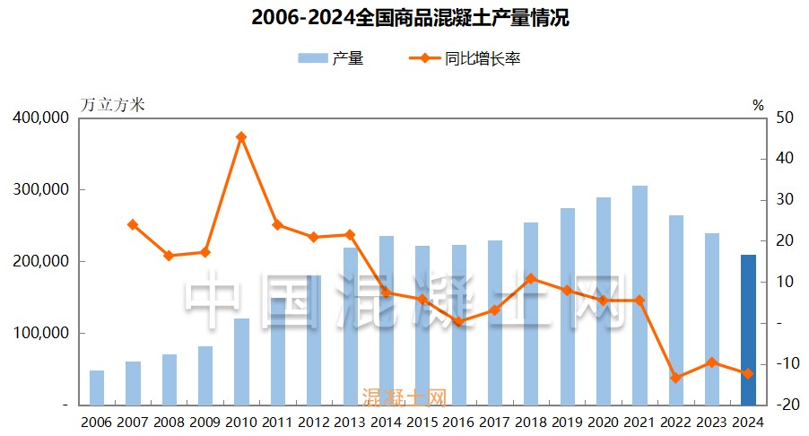2024年中國商品混凝土市場在多重因素交織下呈現(xiàn)復(fù)雜態(tài)勢。據(jù)中國混凝土網(wǎng)的不完全統(tǒng)計,2024年我國商品混凝土總產(chǎn)量為21.01億立方米,較上一年同比下降12.34%。這一收縮主要受房地產(chǎn)行業(yè)深度調(diào)整及基建項目資金到位率偏低的影響。盡管短期承壓,長期來看,新型城鎮(zhèn)化、交通網(wǎng)絡(luò)擴展及“兩新一重”基建投資將持續(xù)釋放需求。行業(yè)需通過技術(shù)創(chuàng)新(如智能生產(chǎn)系統(tǒng))、差異化產(chǎn)品(如特種混凝土)及國際化布局突破瓶頸,政策支持的綠色轉(zhuǎn)型與數(shù)字化升級將成為核心競爭力。