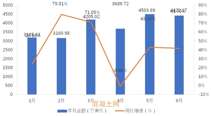 2025年1-6月我國混凝土泵車?yán)塾?jì)出口金額及同比增速