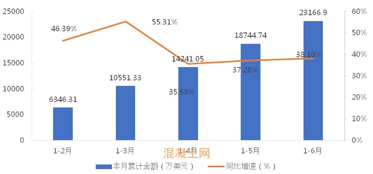 1-6月,我國混凝土泵車?yán)塾?jì)出口金額為23166.90萬美元,同比增長38.10%;累計(jì)出口數(shù)量為1763臺,同比增長45.22%;出口均價為13.14萬美元/臺,同比下降4.92%。