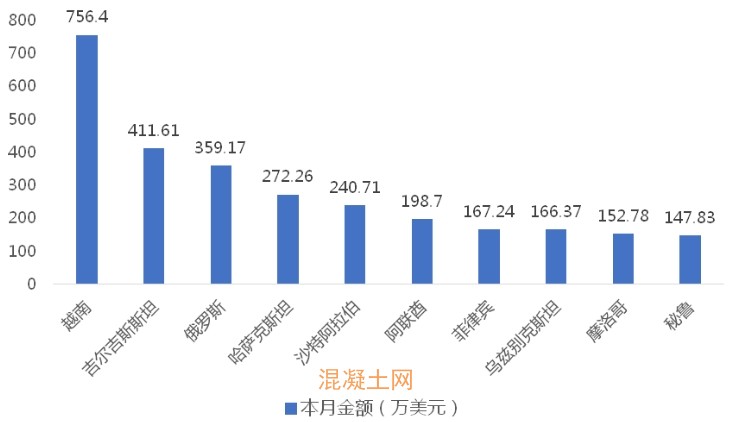 2025年6月,我國混凝土泵車出口金額排名前十位的國家/地區(qū)分別為越南、吉爾吉斯斯坦、俄羅斯、哈薩克斯坦、沙特阿拉伯、阿聯(lián)酋、菲律賓、烏茲別克斯坦、摩洛哥、秘魯,合計(jì)占我國該產(chǎn)品出口總額的64.97%。其中,向越南出口最多,金額為756.40萬美元,占出口總額的17.10%。