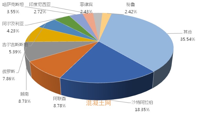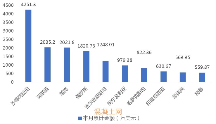 1-6月,我國混凝土泵車出口金額排名前十的國家/地區(qū)分別為沙特阿拉伯、阿聯(lián)酋、越南、俄羅斯、吉爾吉斯斯坦、阿爾及利亞、哈薩克斯坦、印度尼西亞、菲律賓、秘魯,合計(jì)占我國該產(chǎn)品出口總額的64.46%。其中,向沙特阿拉伯出口最多,金額為4251.30萬美元,占出口總額的18.35%。