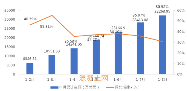 1-8月,我國混凝土泵車累計出口金額為32263.95萬美元,同比增長30.92%;累計出口數(shù)量為2474臺,同比增長44.09%;出口均價為13.04萬美元/臺,同比下降9.13%。