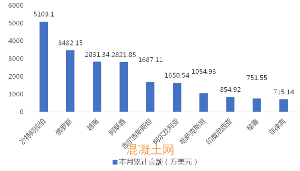1-8月,我國混凝土泵車出口金額排名前十的國家/地區(qū)分別為沙特阿拉伯、俄羅斯、越南、阿聯(lián)酋、吉爾吉斯斯坦、阿爾及利亞、哈薩克斯坦、印度尼西亞、秘魯、菲律賓,合計占我國該產(chǎn)品出口總額的64.94%。其中,向沙特阿拉伯出口最多,金額為5103.10萬美元,占出口總額的15.82%。