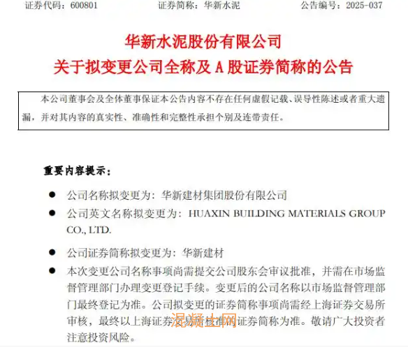 前一天,華新水泥還公告稱,公司擬更名為華新建材集團(tuán)股份有限公司(證券簡(jiǎn)稱,華新建材),證券代碼不變。公司強(qiáng)調(diào),現(xiàn)有名稱中的“水泥”已不能完全涵蓋公司業(yè)務(wù)類型,公司名稱及證券簡(jiǎn)稱變更將實(shí)現(xiàn)經(jīng)營(yíng)范圍與公司名稱的相符,準(zhǔn)確詮釋本公司定位,更好呼應(yīng)企業(yè)愿景,品牌價(jià)值進(jìn)一步賦能公司,符合公司及全體股東的利益。