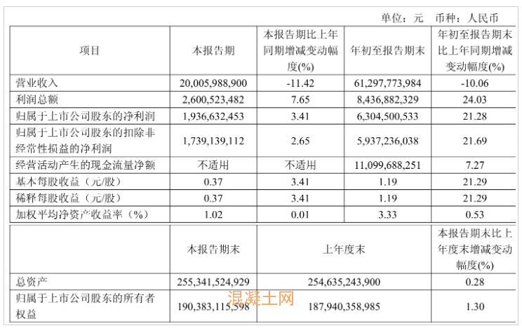 海螺水泥(600585)10月31日披露2025年第三季度報告。前三季度公司實現(xiàn)營業(yè)總收入612.98億元,同比下降10.06%;歸母凈利潤63.05億元,同比增長21.28%;扣非凈利潤59.37億元,同比增長21.69%;經(jīng)營活動產(chǎn)生的現(xiàn)金流量凈額為111億元,同比增長7.27%;報告期內(nèi),海螺水泥基本每股收益為1.19元,加權(quán)平均凈資產(chǎn)收益率為3.33%。