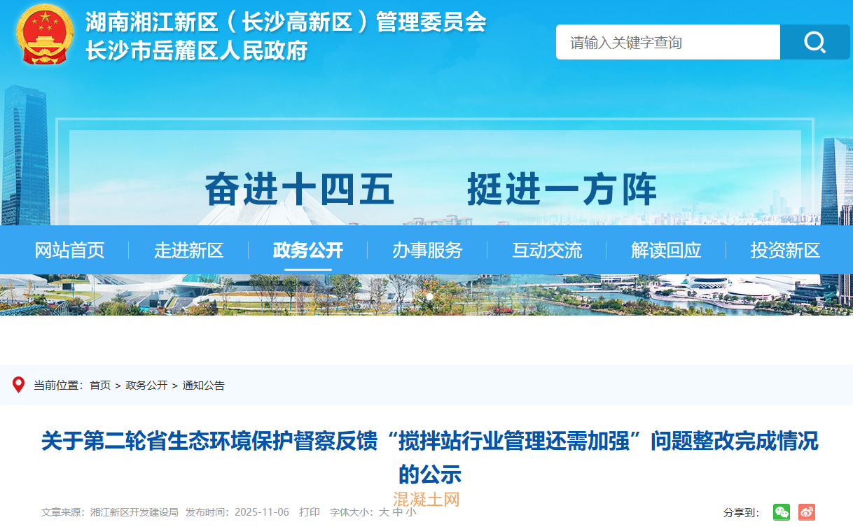 近日,湖南省湘江新區(qū)(長沙高新區(qū))管理委員會發(fā)布《關于第二輪省生態(tài)環(huán)境保護督察反饋“攪拌站行業(yè)管理還需加強”問題整改完成情況的公示》。