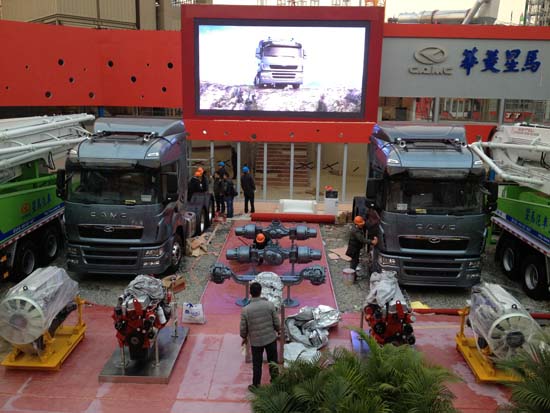 華菱星馬的展臺面積達(dá)1063平米, 參展整車為8臺,包括一臺華菱底盤56米混凝土泵車和一臺五十鈴底盤49米混凝土泵車,一臺常規(guī)動力10方混凝土攪拌車和一臺12方LNG混凝土攪拌車,一臺32噸隨車起重機(jī),一臺40噸礦用自卸車,一臺6×4右駕星凱馬牽引車,一臺6×4左駕星凱馬牽引車。其中56米混凝土泵車和32噸隨車起重機(jī)是首次對外展出。這兩款產(chǎn)品均是華菱星馬去年以來重點(diǎn)打造并于今年正式向市場推出的新產(chǎn)品,代表了其在專用車領(lǐng)域的最新技術(shù)成果。目前這兩款產(chǎn)品已經(jīng)完成了各項(xiàng)試驗(yàn)、試制工作,正在加緊向市場推介過程中,其中56米泵車將在參展結(jié)束后交付上海城建物資有限公司。
