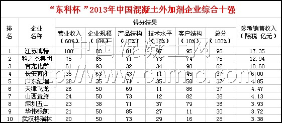 外加劑十強(qiáng)企業(yè)評選說明: