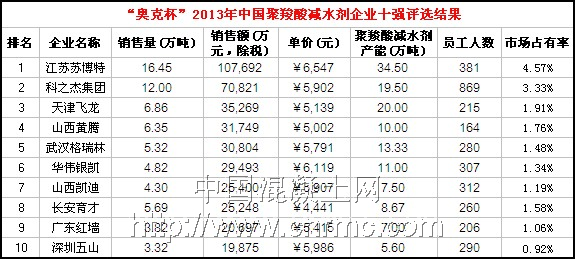 2013年度聚羧酸減水劑企業(yè)十強(qiáng)以2013年各企業(yè)聚羧酸系減水劑實(shí)際銷售收入為依據(jù),數(shù)據(jù)主要來(lái)源為各外加劑企業(yè)自報(bào)、上市企業(yè)年報(bào)以及工商年審資料等。部分企業(yè)因數(shù)據(jù)提供不完整、不及時(shí),暫未被列入其中,如浙江五龍化工等。另外,科隆精化因上市原因也未提交數(shù)據(jù),因此無(wú)緣此次評(píng)選,但這些企業(yè)的未來(lái)發(fā)展同樣值得關(guān)注。望相關(guān)企業(yè)在下次評(píng)選中積極踴躍參與,共同推動(dòng)外加劑行業(yè)的繁榮與發(fā)展。由于時(shí)間有限,本次評(píng)選難免有所疏忽,若其中數(shù)據(jù)有所偏差,請(qǐng)聯(lián)系我們!
