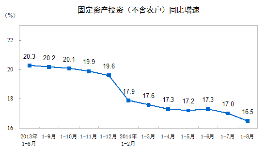 2014年1-8月份,全國固定資產(chǎn)投資(不含農(nóng)戶)305786億元,同比名義增長16.5%,增速比1-7月份回落0.5個百分點。從環(huán)比速度看,8月份固定資產(chǎn)投資(不含農(nóng)戶)增長1.23%。