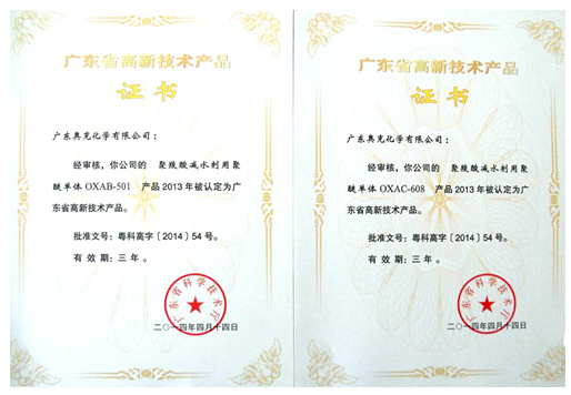 近日,廣東奧克公司在全體員工的共同努力下,經(jīng)過嚴(yán)格的層層審查,最終喜獲由廣東省科學(xué)技術(shù)廳頒發(fā)的“高新技術(shù)產(chǎn)品認(rèn)定證書”。此次獲得高新技術(shù)產(chǎn)品認(rèn)定的產(chǎn)品為“聚羧酸減水劑用聚醚單體OXAB-501”以及“聚羧酸減水劑用聚醚單體OXAC-608”。