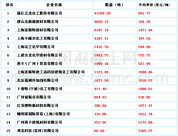 中國混凝土網(wǎng)特別推出本次排名,所用數(shù)據(jù)主要來源于中國海關(guān)總署,本次僅對(duì)水泥、灰泥及混凝土用添加劑(商品代碼:38244000)進(jìn)行統(tǒng)計(jì),其他如非離子型有機(jī)表面活性劑(商品代碼:34021300)等之類的商品未納入本次統(tǒng)計(jì)范圍,在此聲明。本次統(tǒng)計(jì)以海關(guān)總署的實(shí)際統(tǒng)計(jì)數(shù)據(jù)為范本,力爭客觀、公平。但由于時(shí)間有限,難免有所遺誤,如有疑義,請(qǐng)致電中國混凝土網(wǎng)。