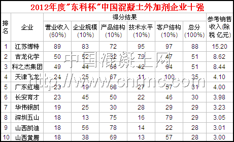 評選內(nèi)容:2012年?duì)I業(yè)收入、企業(yè)規(guī)模、產(chǎn)品結(jié)構(gòu)、技術(shù)水平、客戶結(jié)構(gòu)五項(xiàng)內(nèi)容。 評選規(guī)則: 營業(yè)收入——2012年全年?duì)I業(yè)收入,評分標(biāo)準(zhǔn):以參選企業(yè)的營業(yè)收入20億元為基數(shù)打分。權(quán)重60%; 企業(yè)規(guī)模——從企業(yè)產(chǎn)能方面進(jìn)行綜合評分,評分標(biāo)準(zhǔn):以參選企業(yè)的產(chǎn)能所占比例60%進(jìn)行評分,最高值為滿分。權(quán)重10%; 產(chǎn)品結(jié)構(gòu)——從聚羧酸系減水劑銷售額占比以及終端產(chǎn)品銷售占比評分,評分標(biāo)準(zhǔn):聚羧酸系減水劑銷售占比與終端產(chǎn)品銷售占比兩者分別為50%。權(quán)重10%; 技術(shù)水平——從企業(yè)專利數(shù)以及技術(shù)人員比重兩方面評分,評分標(biāo)準(zhǔn):專利數(shù)以50為基數(shù),企業(yè)技術(shù)人員以300人為基數(shù),兩者平分技術(shù)分值。權(quán)重10%; 客戶結(jié)構(gòu)——從公司銷售對象為商混站和野外工程項(xiàng)目占比評分,評分標(biāo)準(zhǔn):商品混凝土客戶銷售占70%者為滿分,高于或低于此比例按比例減分。權(quán)重10%。 |