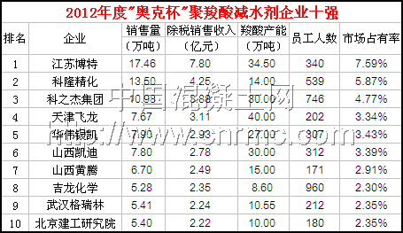 評選內(nèi)容:2012年聚羧酸減水劑銷售量、除稅銷售收入、羧酸產(chǎn)能、市場占有率四項內(nèi)容。 評選規(guī)則: 1.以企業(yè)的聚羧酸減水劑除稅銷售收入為主要排名依據(jù)。以參選企業(yè)的除稅銷售收入最高值為滿分。 2.以企業(yè)的聚羧酸減水劑銷售量、產(chǎn)能、以及市場占有率等各方面數(shù)據(jù)進行綜合評分。 |