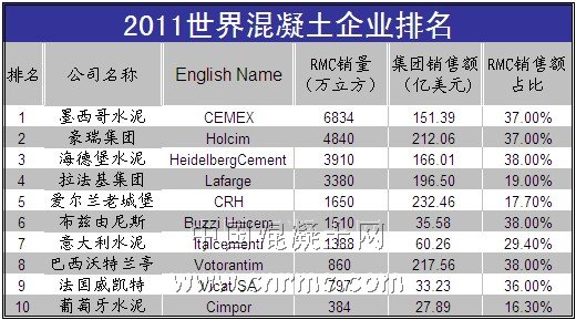 愛爾蘭CRH公司是結(jié)合了生產(chǎn)與銷售為一體的國際建材公司。公司旗下在36個國家設(shè)立了3600個營業(yè)地點,多元化的提供建材材料。 公司2011年的總銷售收入為222.16億美元,相比于2010年的209.65億美元增長了5%;混凝土銷量方面,公司2010為1500萬方,2011年則為1610萬方,增長了7.3%。 ◇詳細點擊 |