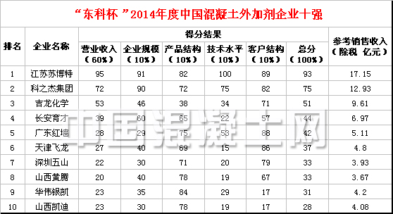 混凝土外加劑企業(yè)綜合十強(qiáng)評選是以2014年各企業(yè)實際銷售額為依據(jù),數(shù)據(jù)主要來自各外加劑企業(yè)上報、企業(yè)年報以及政府審計報告。部分企業(yè)因數(shù)據(jù)提供不完 整、不及時,暫未被列入其中,望相關(guān)企業(yè)在下次評選中積極踴躍參與,共同推動外加劑行業(yè)的繁榮與發(fā)展。由于時間有限,本次評選難免有所疏忽,若其中數(shù)據(jù)有 所偏差,請聯(lián)系我們!