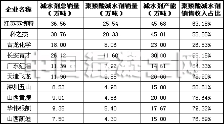 從統(tǒng)計的數(shù)據(jù)來看,十強(qiáng)榜單中,銷售收入過10億的企業(yè)有兩家,為江蘇蘇博特和科之杰集團(tuán),兩家公司減水劑總銷量均超過30萬噸。十強(qiáng)榜單中有六家企業(yè)減 水劑總銷量過10萬噸,包括江蘇蘇博特、科之杰集團(tuán)、吉龍化學(xué)、長安育才、廣東紅墻和天津飛龍。十強(qiáng)中減水劑總產(chǎn)能超過40萬噸的有兩家,為江蘇蘇博特和 科之杰集團(tuán);產(chǎn)能介于20-30萬噸的共有四家,為吉龍化學(xué)、長安育才、天津飛龍和山西黃騰,產(chǎn)能小于20萬噸的有四家,為廣東紅墻、深圳五山、華偉銀凱 和山西凱迪。