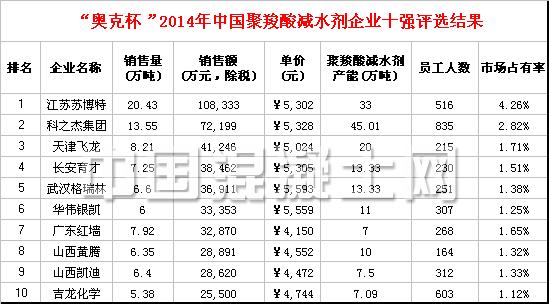 2014年度聚羧酸減水劑企業(yè)十強以2014年各企業(yè)聚羧酸系減水劑實際銷售收入為依據(jù),數(shù)據(jù)主要來源為各外加劑企業(yè)自報、上市企業(yè)年報以及工商年審資料 等。部分企業(yè)因數(shù)據(jù)提供不完整、不及時,暫未被列入其中。望相關(guān)企業(yè)在下次評選中積極踴躍參與,共同推動外加劑行業(yè)的繁榮與發(fā)展。由于時間有限,本次評選 難免有所疏忽,若其中數(shù)據(jù)有所偏差,請聯(lián)系我們!